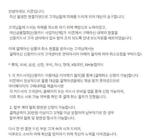 카드사에게 먼저 환불을 해주고, 나중에 정산을 받으라는 지침은 카드사와 PG업체들에게 큰 부담을 주고 있습니다. 정부와 금융당국의 미흡한 대응은 문제 해결을 더욱 어렵게 만들고 있습니다.